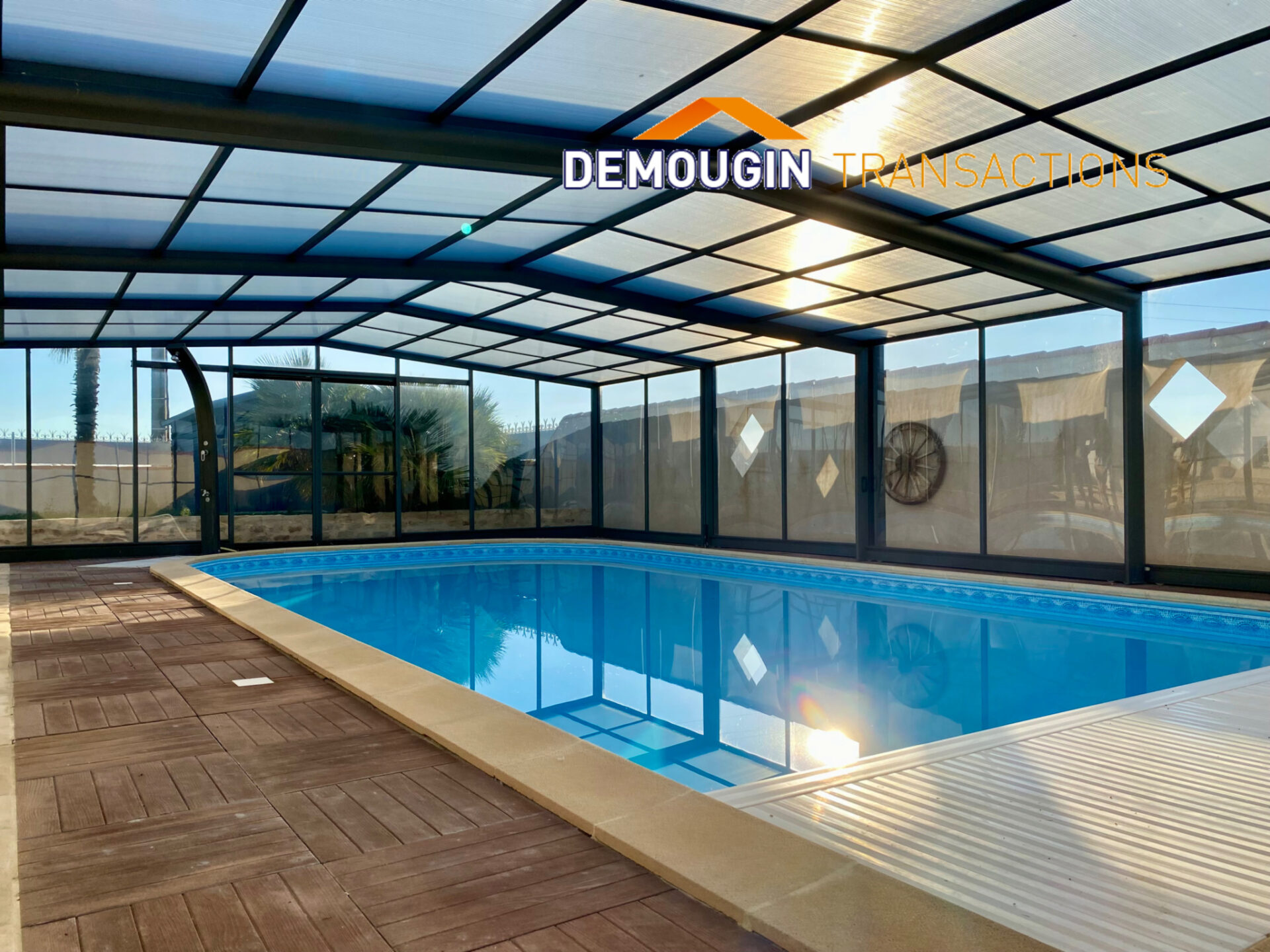 Les espaces exterieurs ne sont pas en reste avec une trés belle piscine couverte, un cabanon et un joli jardin d’accueil.